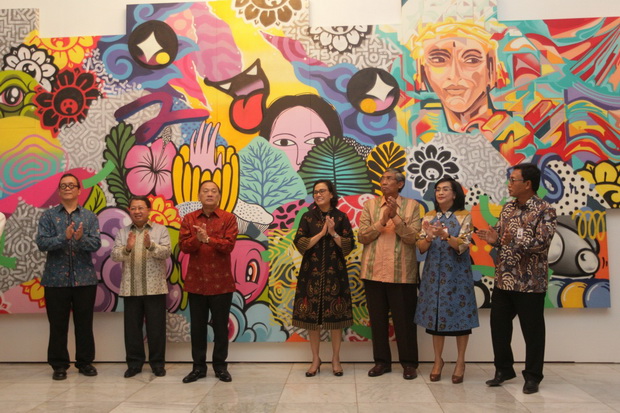 Pembukaan Voyage to Indonesia Art Exhibition di Gedung Jusuf Anwar Kementerian Keuangan pada hari Selasa (13 Maret 2018) dihadiri oleh Menteri Keuangan RI Sri Mulyani Indrawati, Gubernur Bank Indonesia Agus Martowardojo, serta Direktur Hubungan Kelembagaan & Transaksional Perbankan BNI Adi Sulistyowati. (Dok Humas BNI)