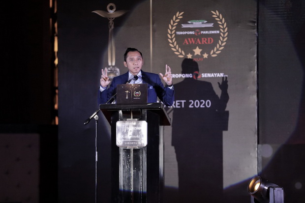 Ketua Fraksi Partai Demokrat Edhie Baskoro Yudhoyono saat memberikan sambutan di acara Malam Penganugerahan Teropong Parlemen Award 2020 yang diselenggarakan oleh Media Teropong Senayan, 16 maret 2020. (dok: Istimewa)