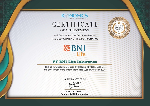 Jakarta Review, Jakarta – PT BNI Life Insurance (BNI Life) dinobatkan sebagai The Best Sharia Unit Life Insurance pada ajang Iconomic Syariah Award 2021 yang diselenggarakan oleh media Iconomics.